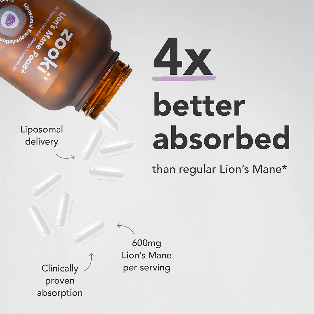 600mg of Lion's Mane per serving, with an added 100mg of L-Theanine, 250mg of Cognizin Citicoline, 120mg of Omega 3 DHA and 150mcg of Vitamin B12. Combined with our signature liposomal formula for up to 4x higher absorption